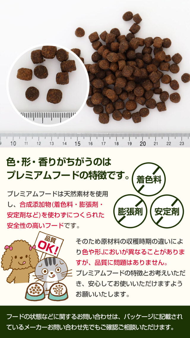 ・稀にフードに毛が付着しているように見える物がありますが、これは原材料の繊維質ですので愛犬が食べても全く問題ありませんのでご安心ください。