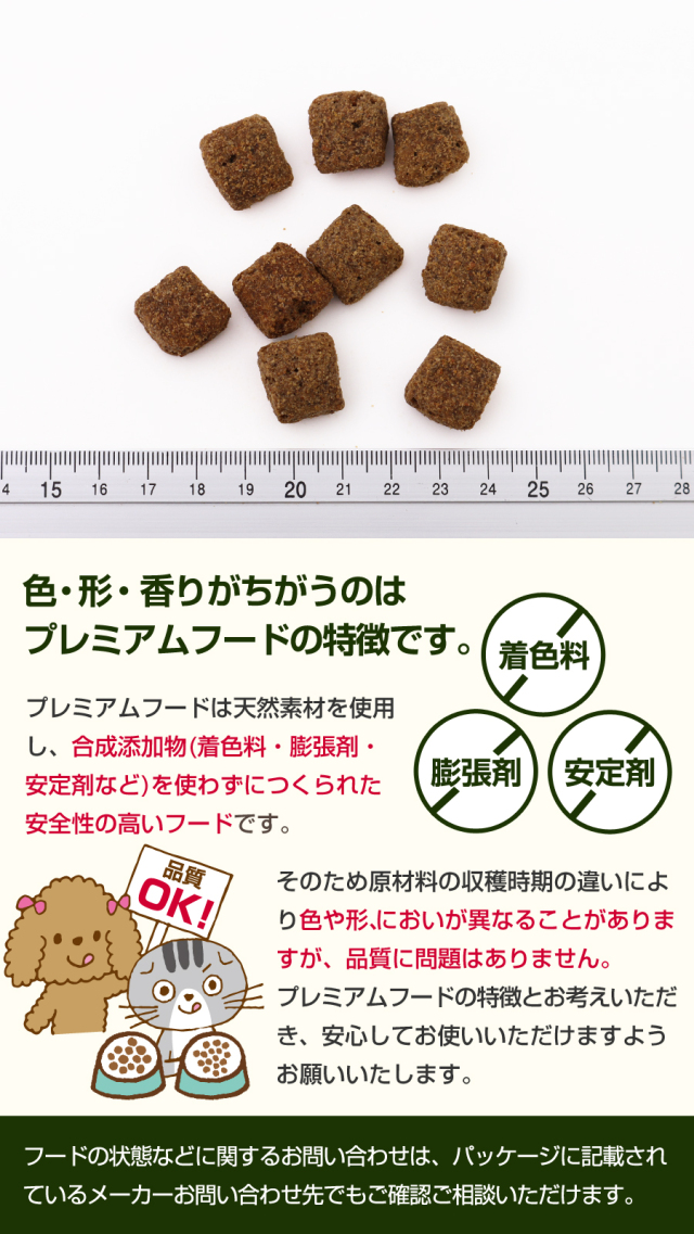 粗タンパク質:27%以上、粗脂質:9%以上、粗繊維質:7%以下、水分:9%以下、粗灰分:7%以下、カルシウム:1.1%、リン:0.8%、ナトリウム:0.35%、カリウム:0.51%、マグネシウム:0.13%、オメガ6:1.5%、オメガ3:0.8%