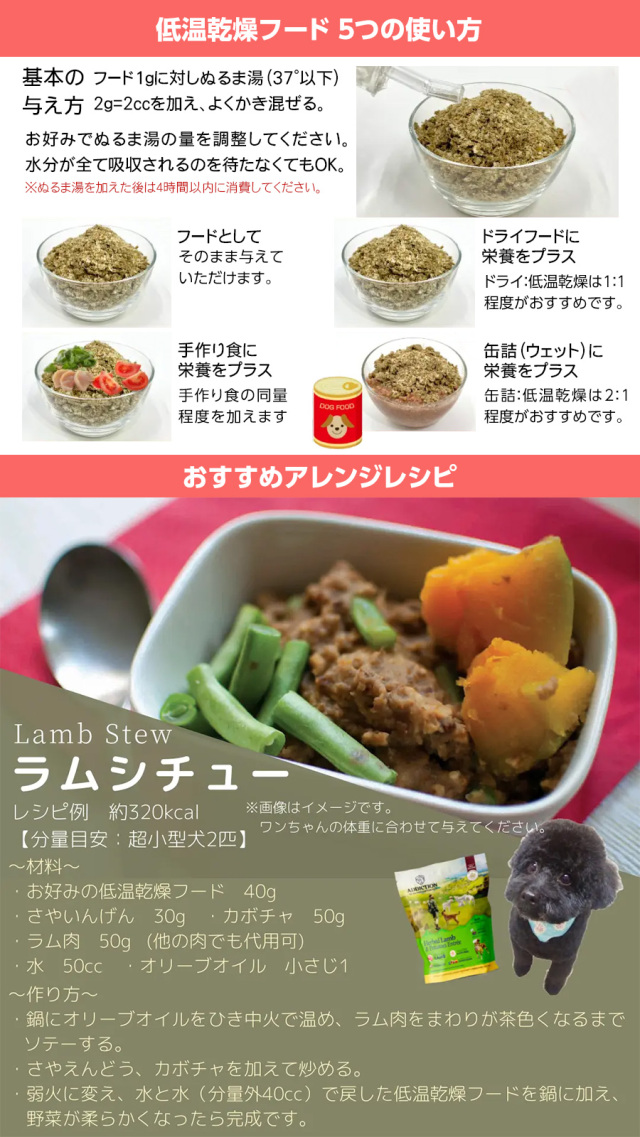 ラム生肉、ポテト、ニンジン、フラックスシード、ココナッツオイル、タピオカ、パパイヤ、クランベリー、ブルーベリー、マンゴー、アップル、バジル、ローズマリー、タイム、ペパーミント、ほうれん草、天然フレーバー、リン酸二カルシウム、醸造用酵母、シーソルト、硫酸マグネシウム、炭酸カルシウム、塩化コリン、ビタミンA、ビタミンD3、ビタミンE、硝酸チアミン、リボフラビン、パントテン酸カルシウム、ナイアシン、塩酸ピリドキシン、葉酸、ビタミンB12、硫酸第一鉄、硫酸銅、硫酸マンガン、硫酸亜鉛、ヨウ素酸カルシウム、亜セレン酸ナトリウム、硫酸コバルト、タウリン、緑茶エキス、ローズマリーエキス、スペアミントエキス、酸化防止剤(ミックストコフェロール)