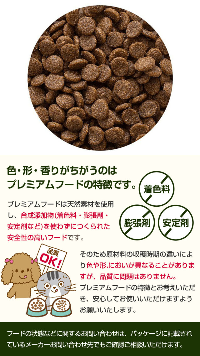 チキン、魚介類、コーン、コメ、大麦、ビート繊維、亜麻仁、チキンオイル、ビール酵母(ビタミンプレミックスを含む)